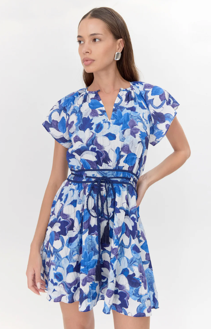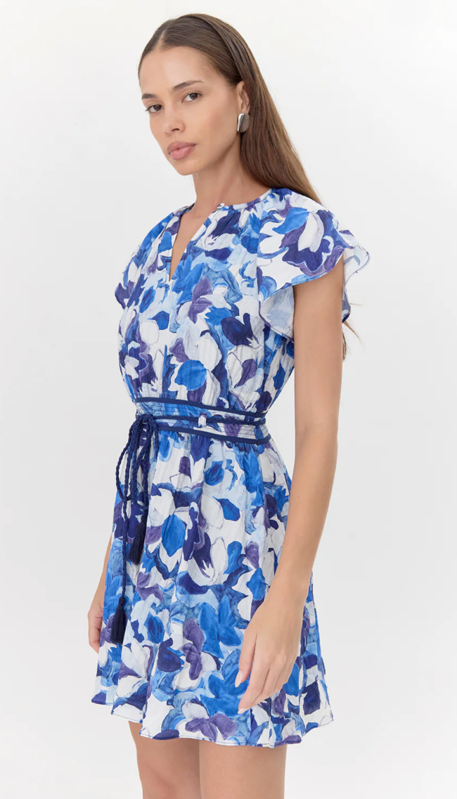 The "Aeila Dress" is defined by it's floral print and relaxed silhouette. The design features a braided waist belt with tassels and a notched neckline with a button closure. The mini dress is finished with flutter sleeves and a contrasting waist band.