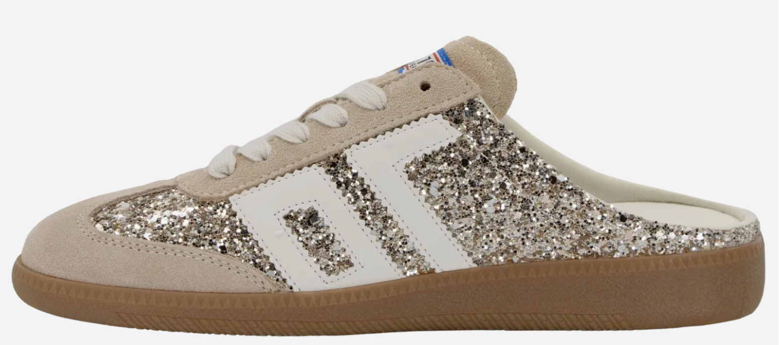 The Back 70 glitter mule brings sparkle to everyday style with a distinctly feminine, boho edge. Designed in shimmering gold glitter, this effortless sneaker mule blends laid-back charm with the brand’s signature vintage detailing. The open-back silhouette adds ease and personality, while subtle suede trims and retro accents keep it unmistakably Back 70. A perfect mix of glamour and casual cool, it’s made for the girlie girl who loves her sneakers with a little shine.