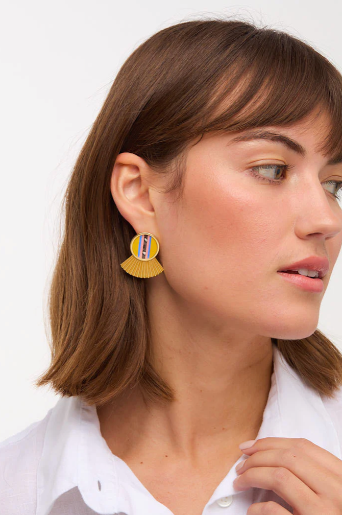 Bold, vibrant, and full of personality, the Adelaide Large Stud Earrings are crafted from a stunning mix of goose, guinea, and turkey feathers in a harmonious blend of periwinkle blue, shrimp pink, touches of yellow, and black and white polka dots. The dynamic combination of colors and patterns creates an eye-catching design that’s both playful and sophisticated. These statement earrings bring an elevated touch of nature’s beauty to any ensemble, offering a pop of color and artistry that will turn heads wherever you go.