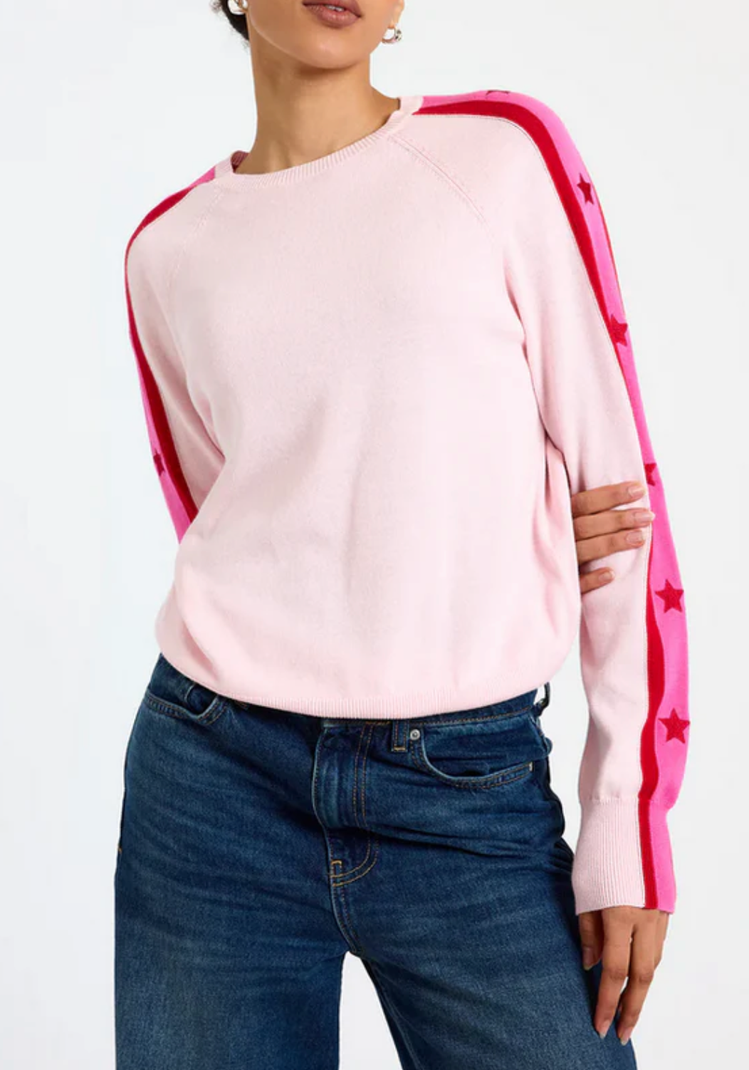 The Sofie Star Sweater is a fun, feminine knit pullover with a playful yet stylish design. It features a soft light pink base color with standout bright pink and red detailing along the sleeves.