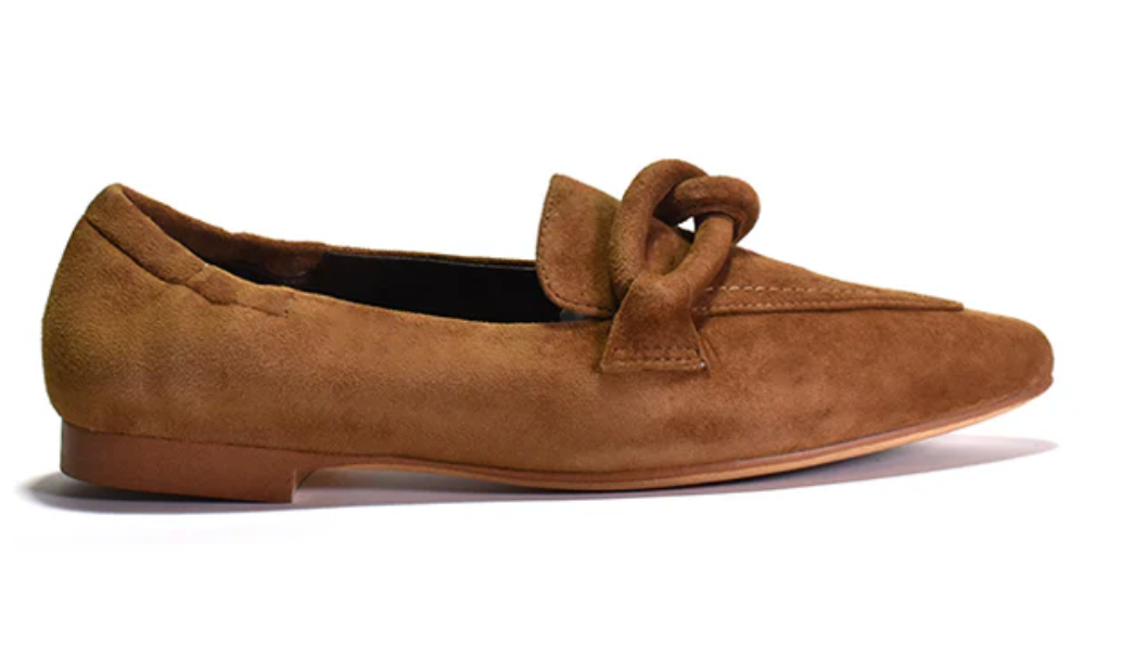 Flat pointed loafer made using the ever-so-comfortable sacchetto construction. Suede upper with suede chain buckle and elasticized back for secure fit. Slip on. Leather lining. Leather sole no-slip insert and synthetic heel. Padded footbed. Made in Italy.