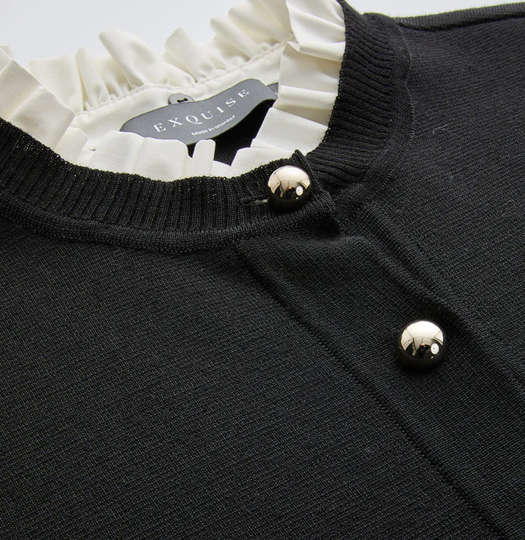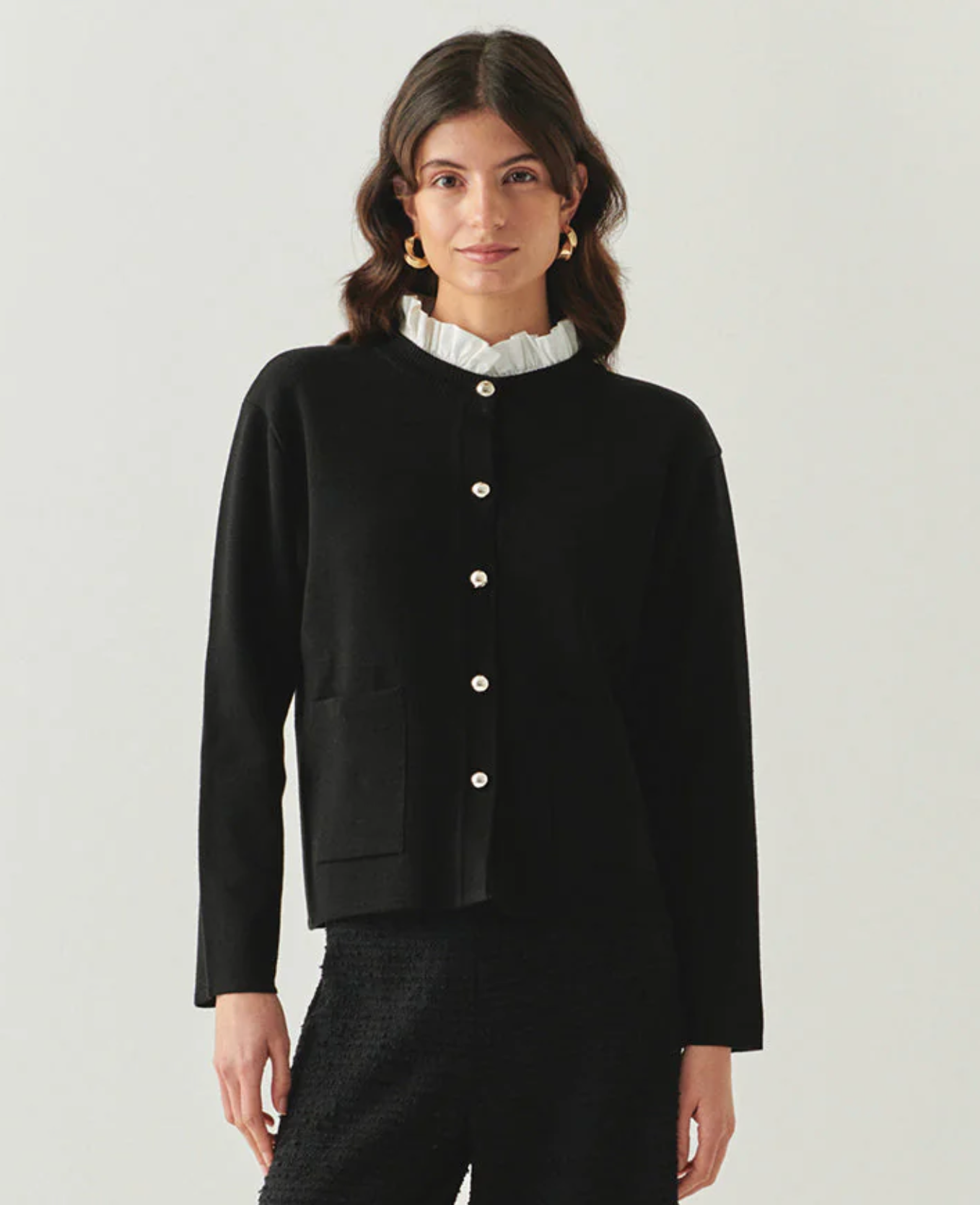 The Kamilah Knit Cardigan offers a tailored silhouette with classic crew neck, delicate pocket detailing, and a removable poplin collar—perfect for refined, versatile layering.