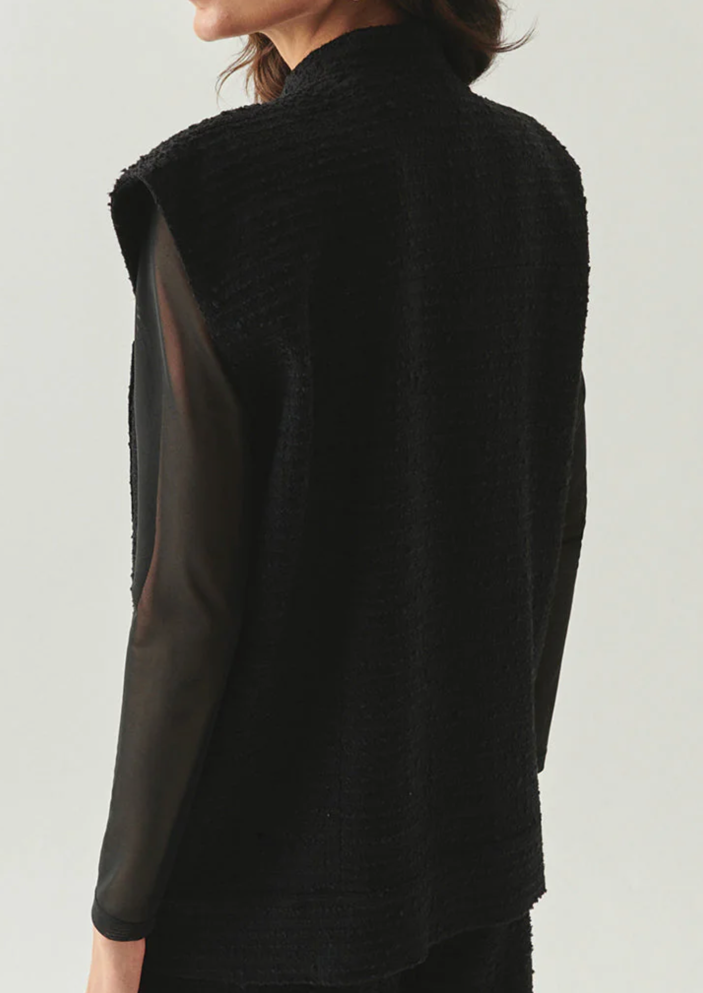 The Goldie Vest features a high neckline and sleeveless shape, accented with bold gold buttons and front pockets. Crafted from a textured cotton-blend for added dimension.