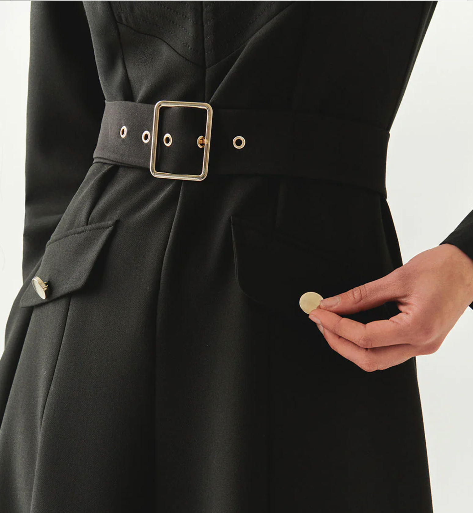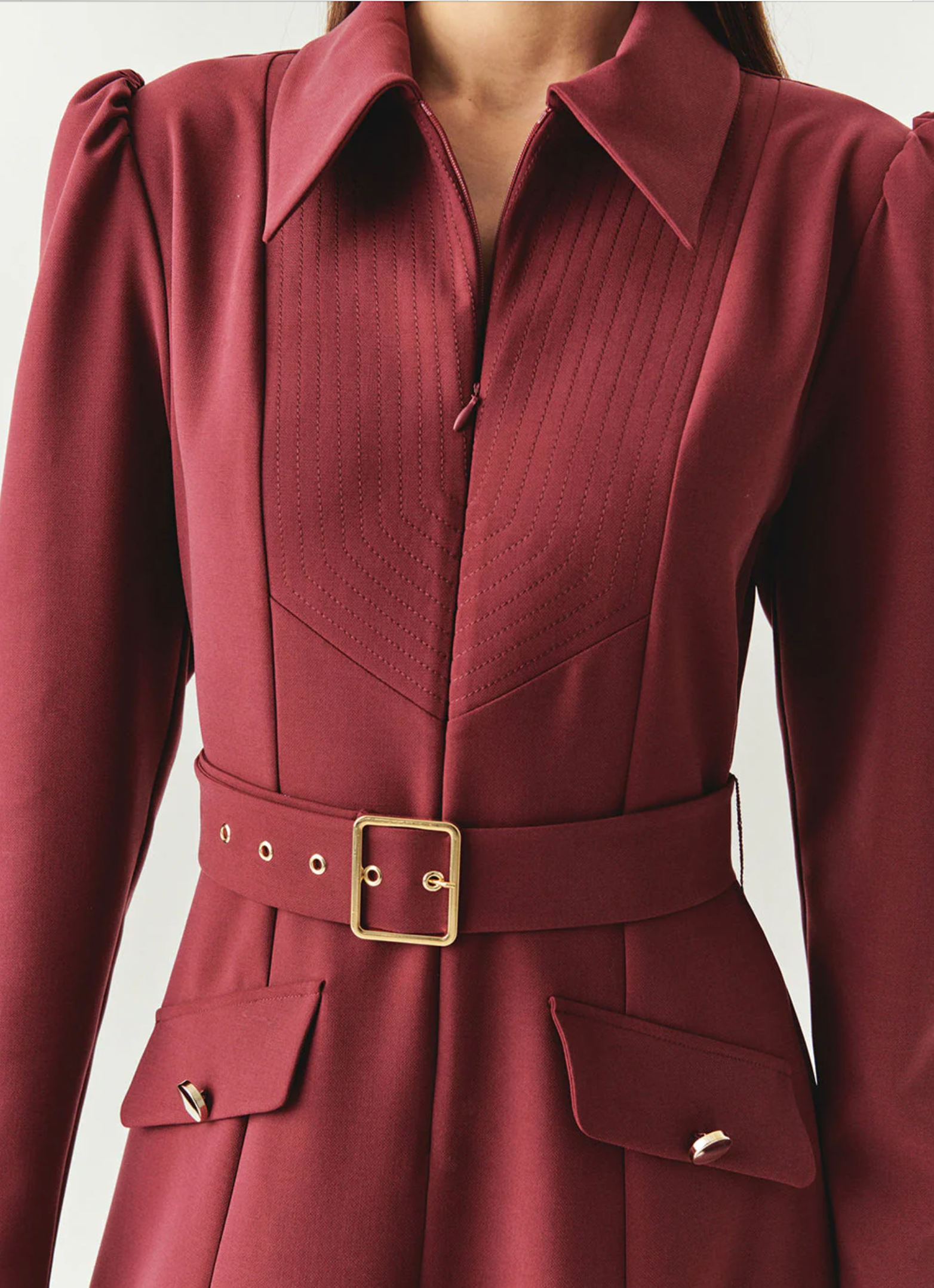 Slim Fit Midi Dress With Front Zipper, Long Sleeves, And Belt