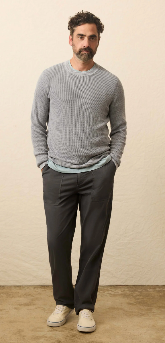 Designed as an easy to wear, transitional sweater., this will be your go-to year-round crew. Our cotton yarn is super soft but not overly warm and knit in an airy, waffle stitch giving the sweater dimension and texture. It's then garment-dyed and washed for a lived in, vintage look and feel that's casually cool for any occasion.