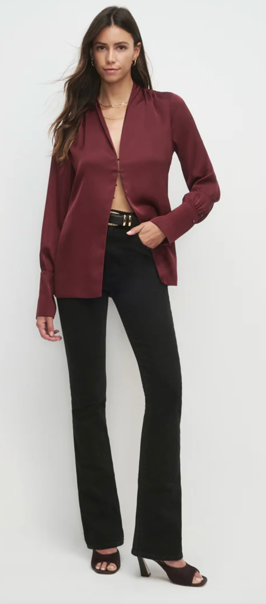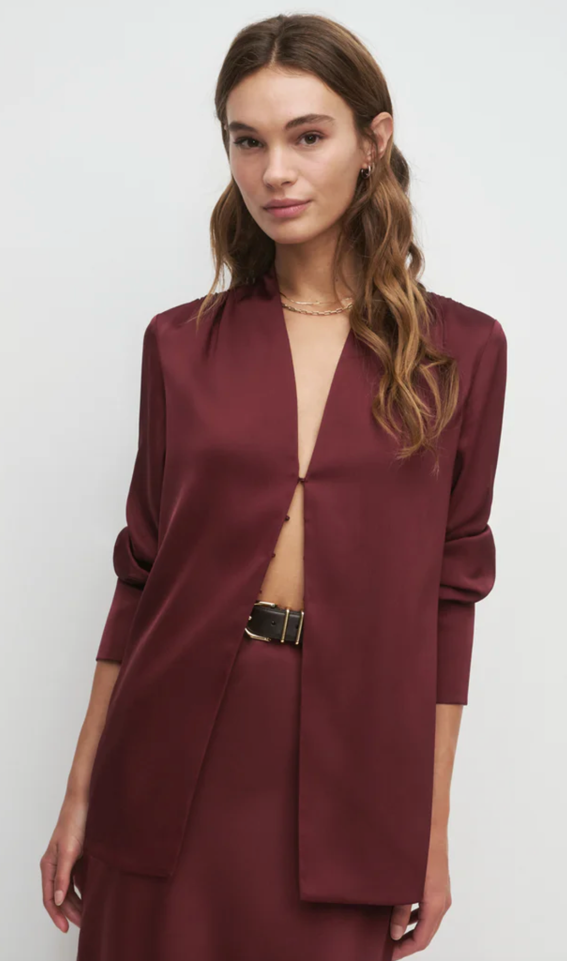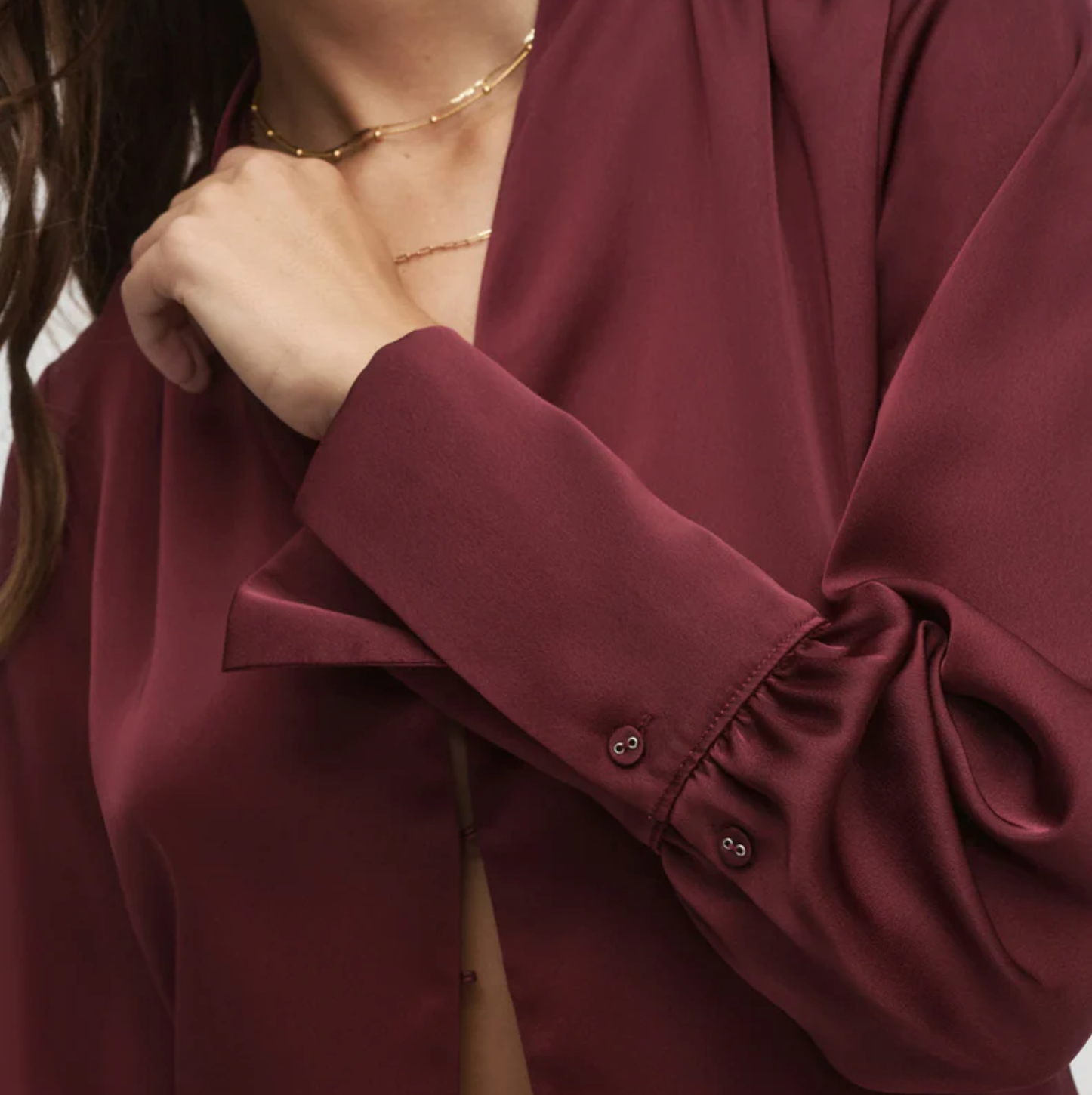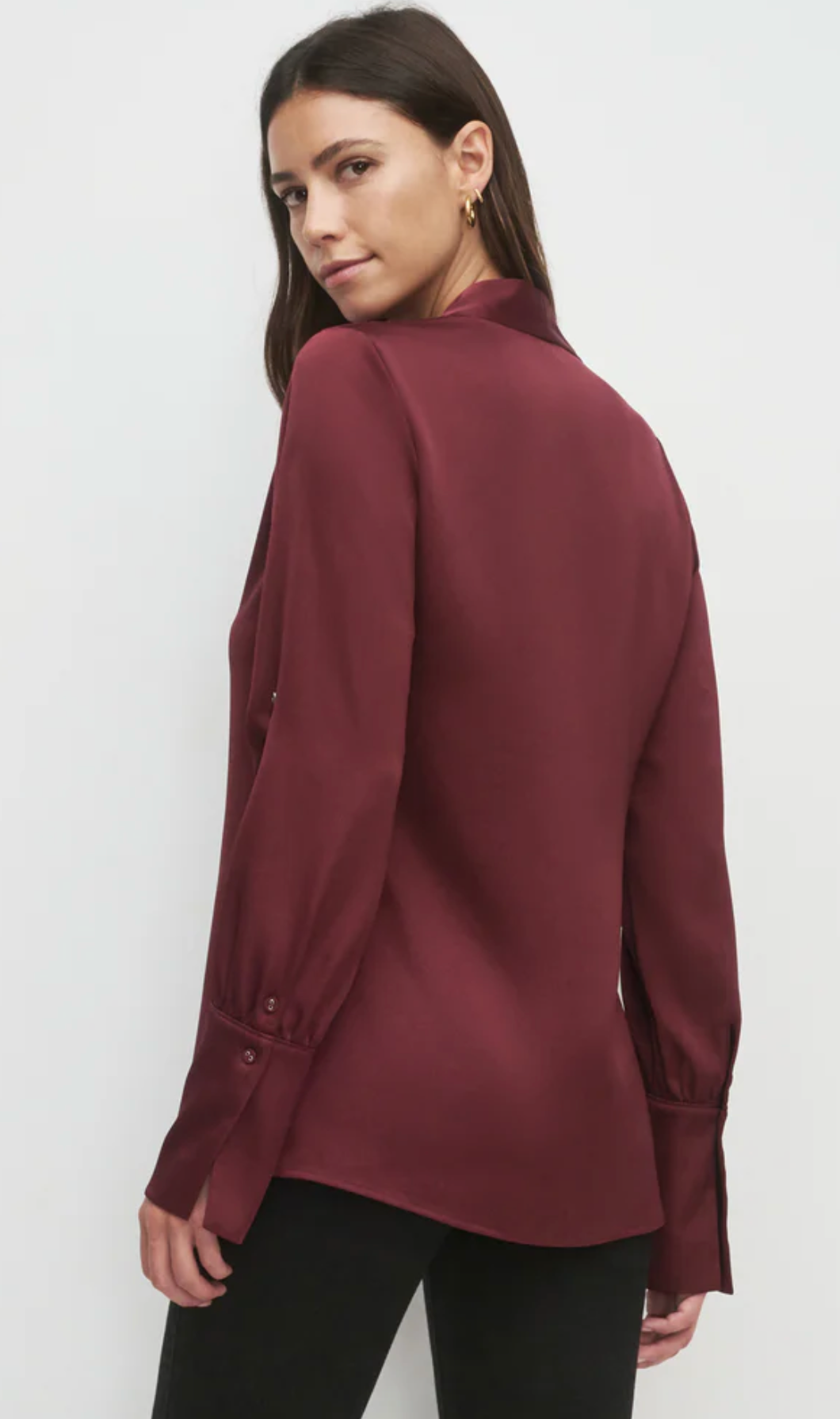 Add a silky satin layer with The Izzy Top. It's gathered at the shoulders for a soft drape and is finished with an exaggerated cuff detail and hook & eye closure. We especially love layering it over The Favorite Skirt for a soft, fluid set.