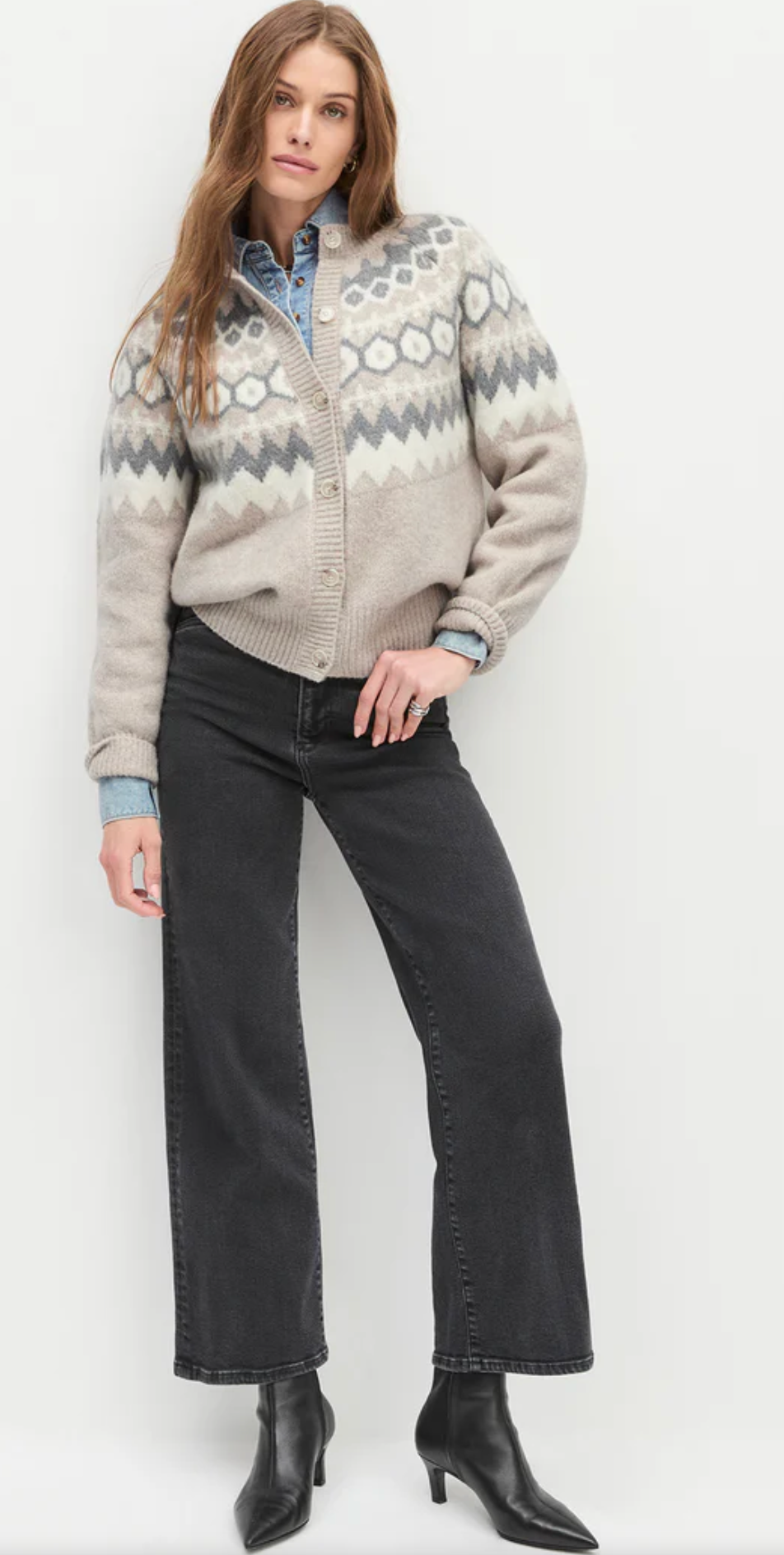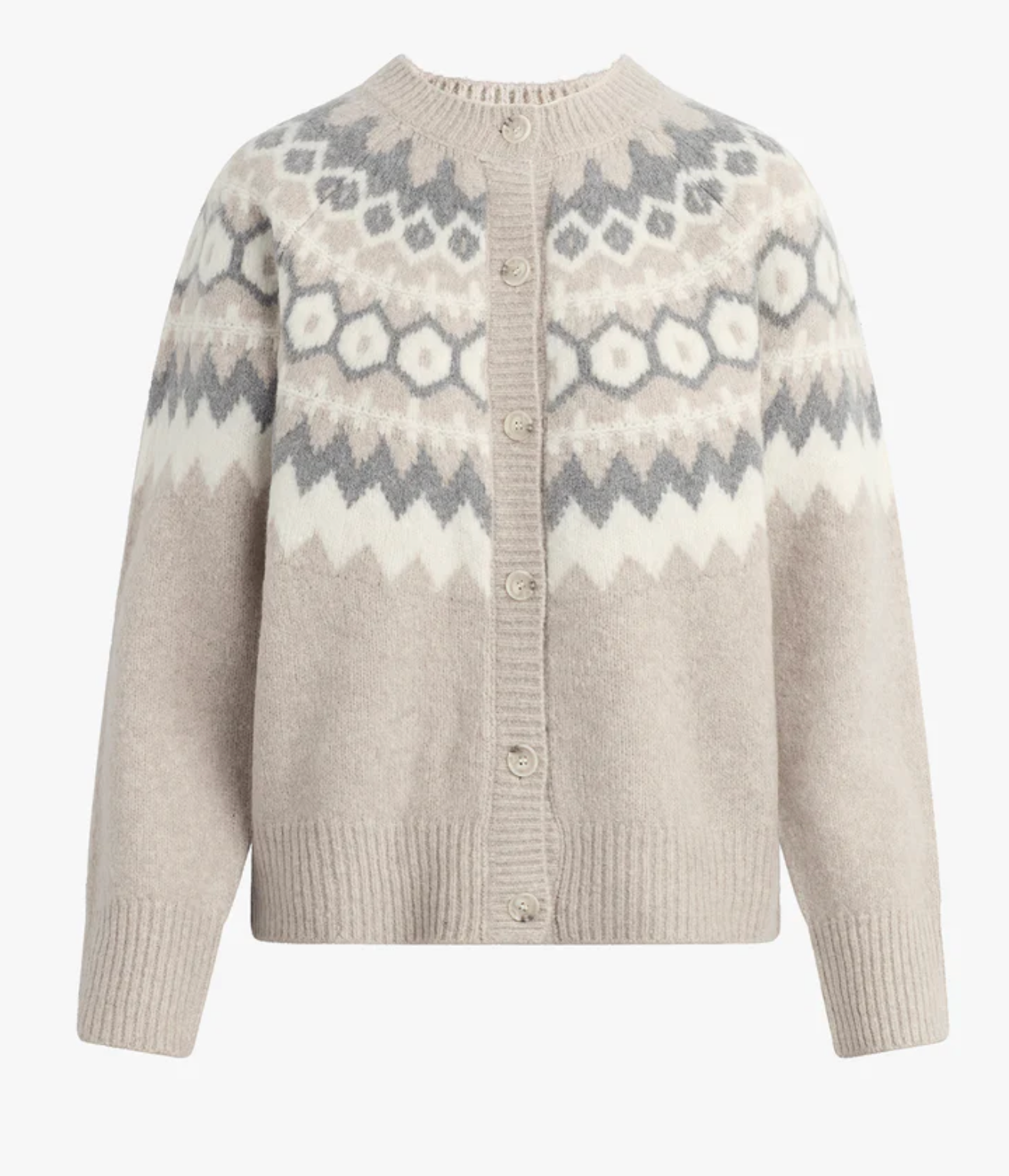 This cozy, oversized cardigan is sure to be a cold weather favorite in a classic fair isle pattern. It's crafted from a cashmere-wool blend for just the right amount of softness with an intarsia pattern in the most perfect seasonal shades.