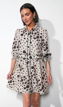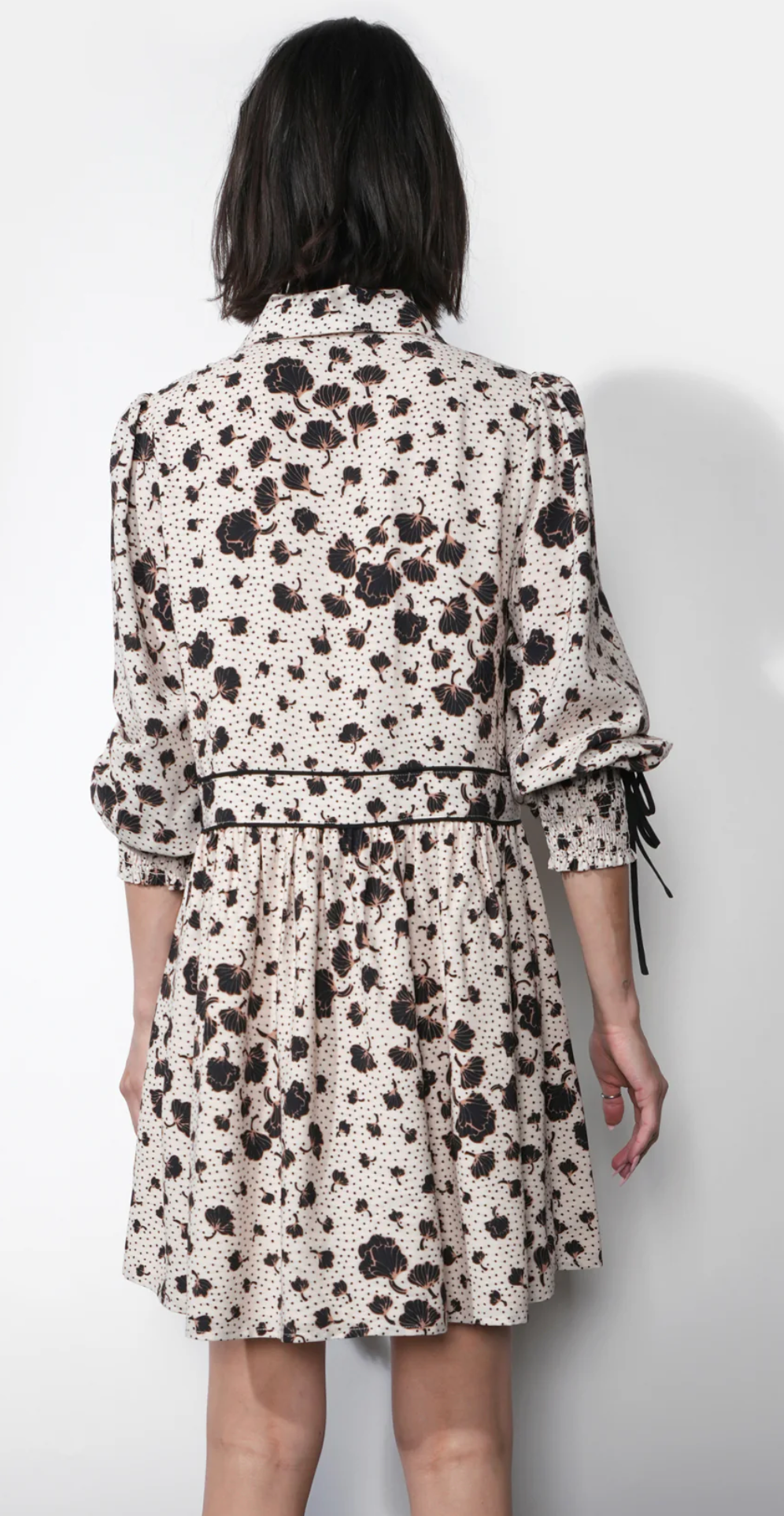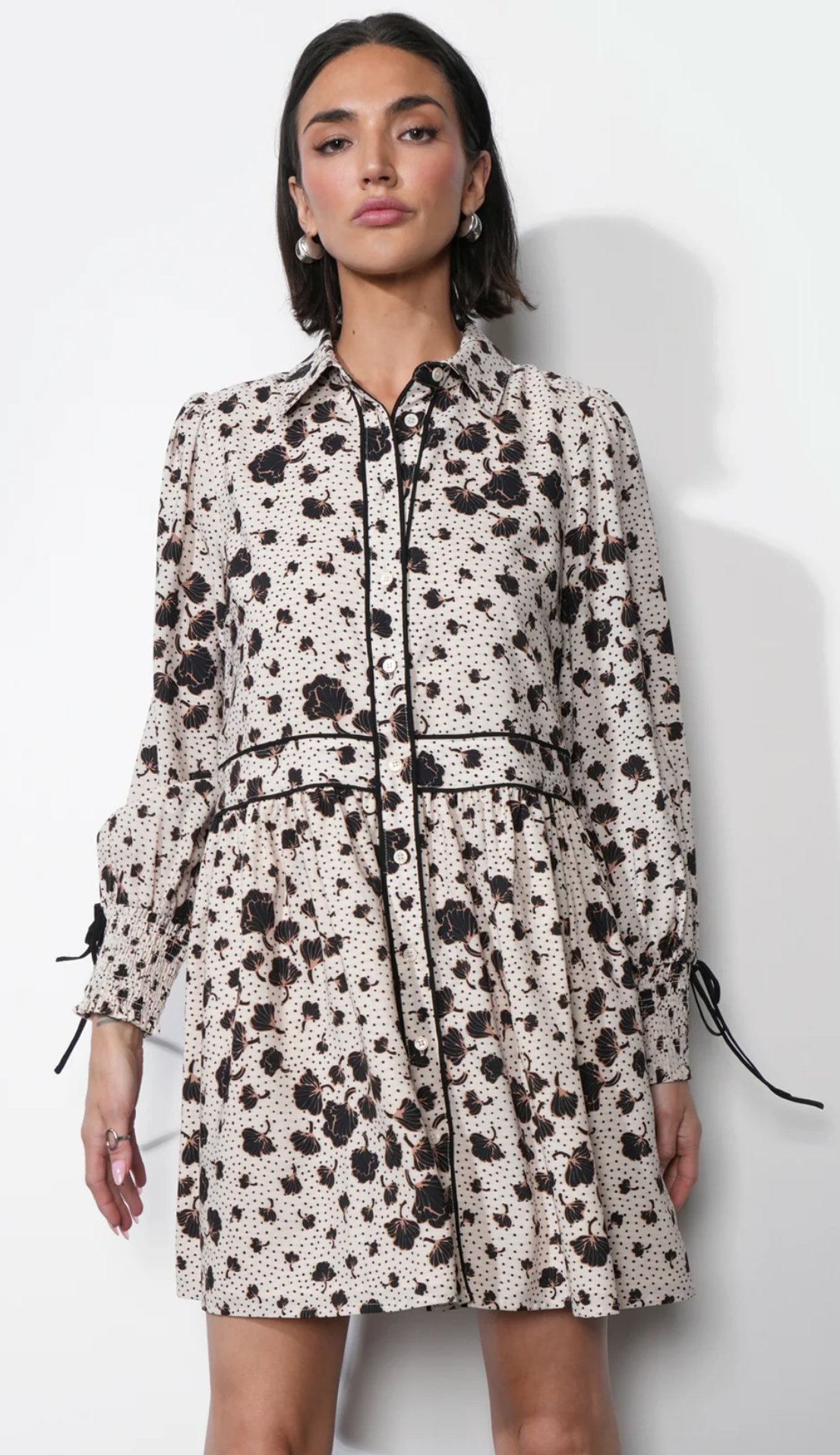 It features a full button-down front and a crisp collar. The detail that sets it apart is the contrasting piping accenting the seams, edges, or placket, which adds a tailored, graphic element to the clean ivory fabric.