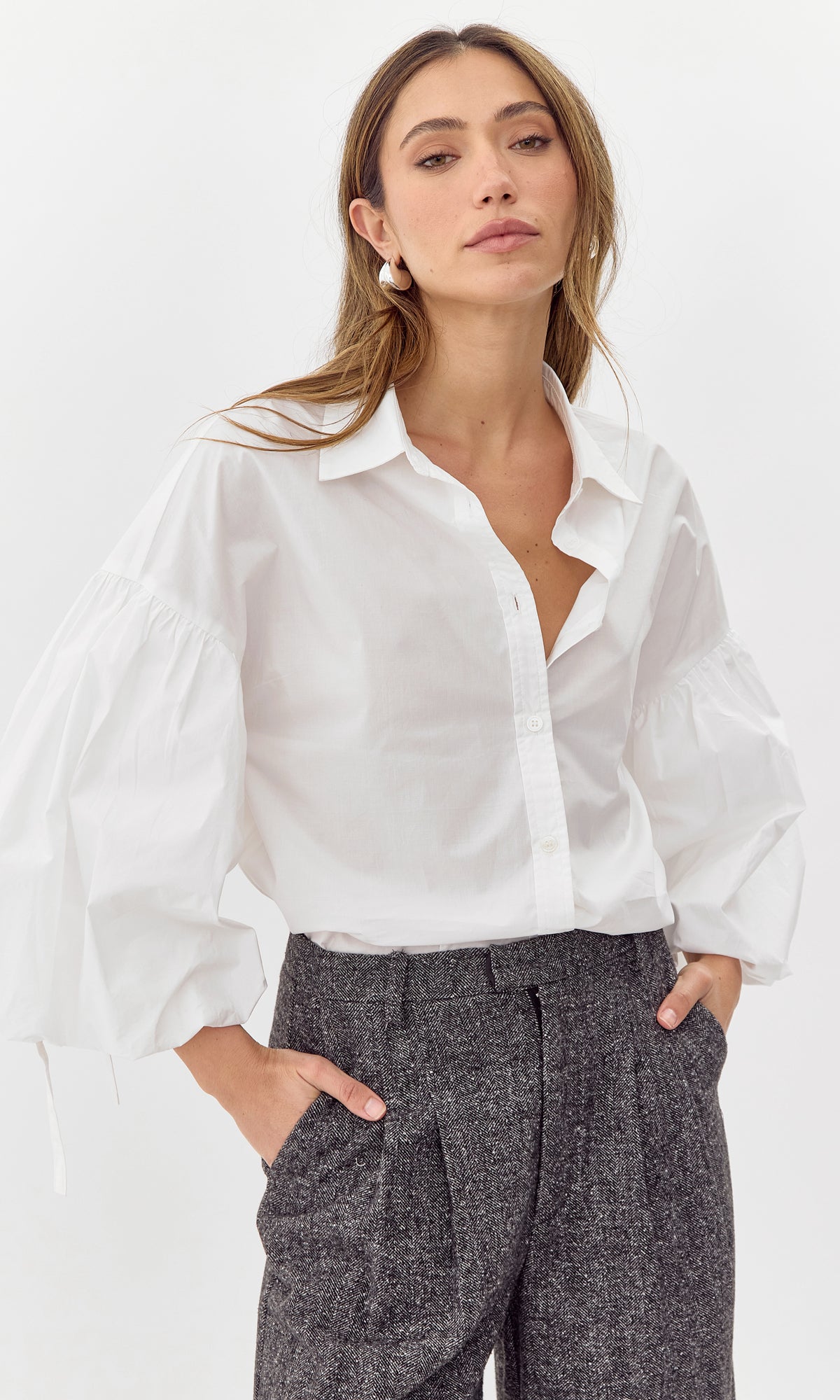 The Brianna Shirt is a stunning white balloon sleeve button-down that exudes sophistication and timeless elegance. Its voluminous sleeves and tailored fit make it a standout piece that adds a touch of drama to any outfit. Pair it with the Adele Trouser for a chic, polished look that effortlessly combines style and refinement.