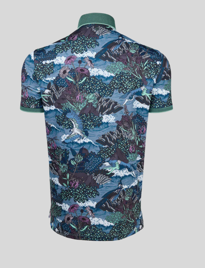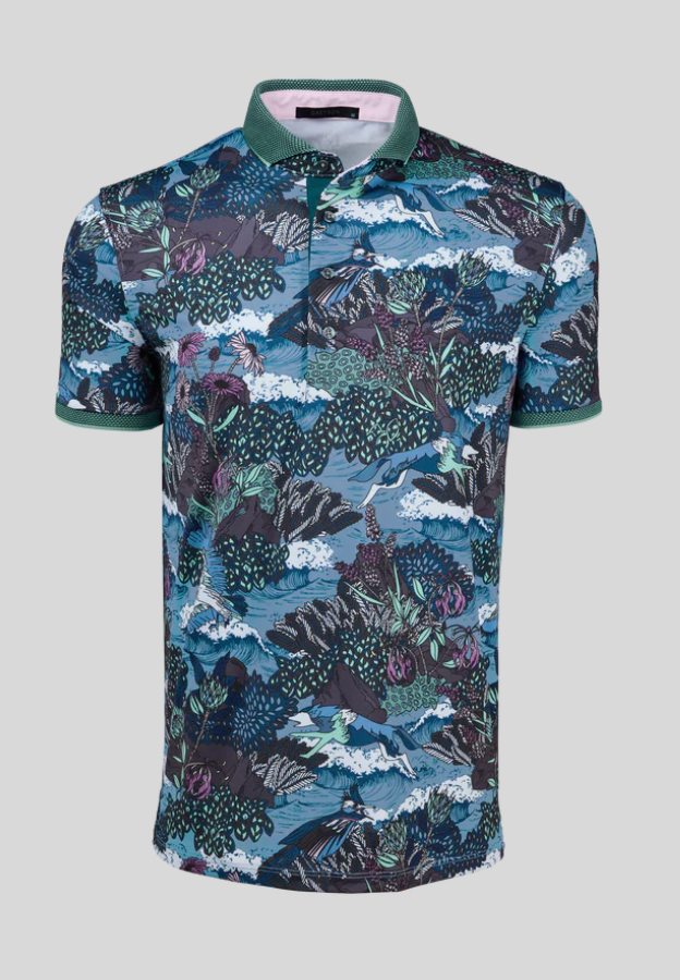 The In The Waves Polo features an artistic print that brings a sense of movement and energy to a timeless silhouette. Crafted from breathable performance fabric, it offers natural stretch and quick-drying comfort for all-day wear. The pattern makes a statement yet is balanced, making it a standout piece that remains versatile. This performance printed polo is finished with a knit jacquard cutaway collar, matching cuffs, and a four-button placket with contrast detailing.