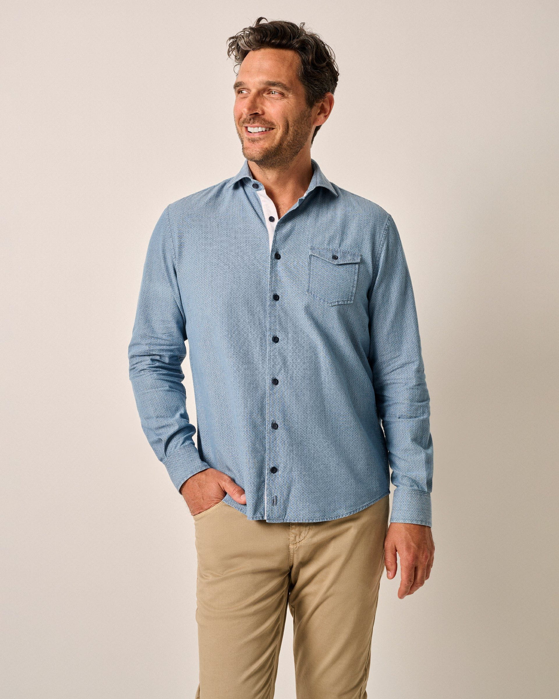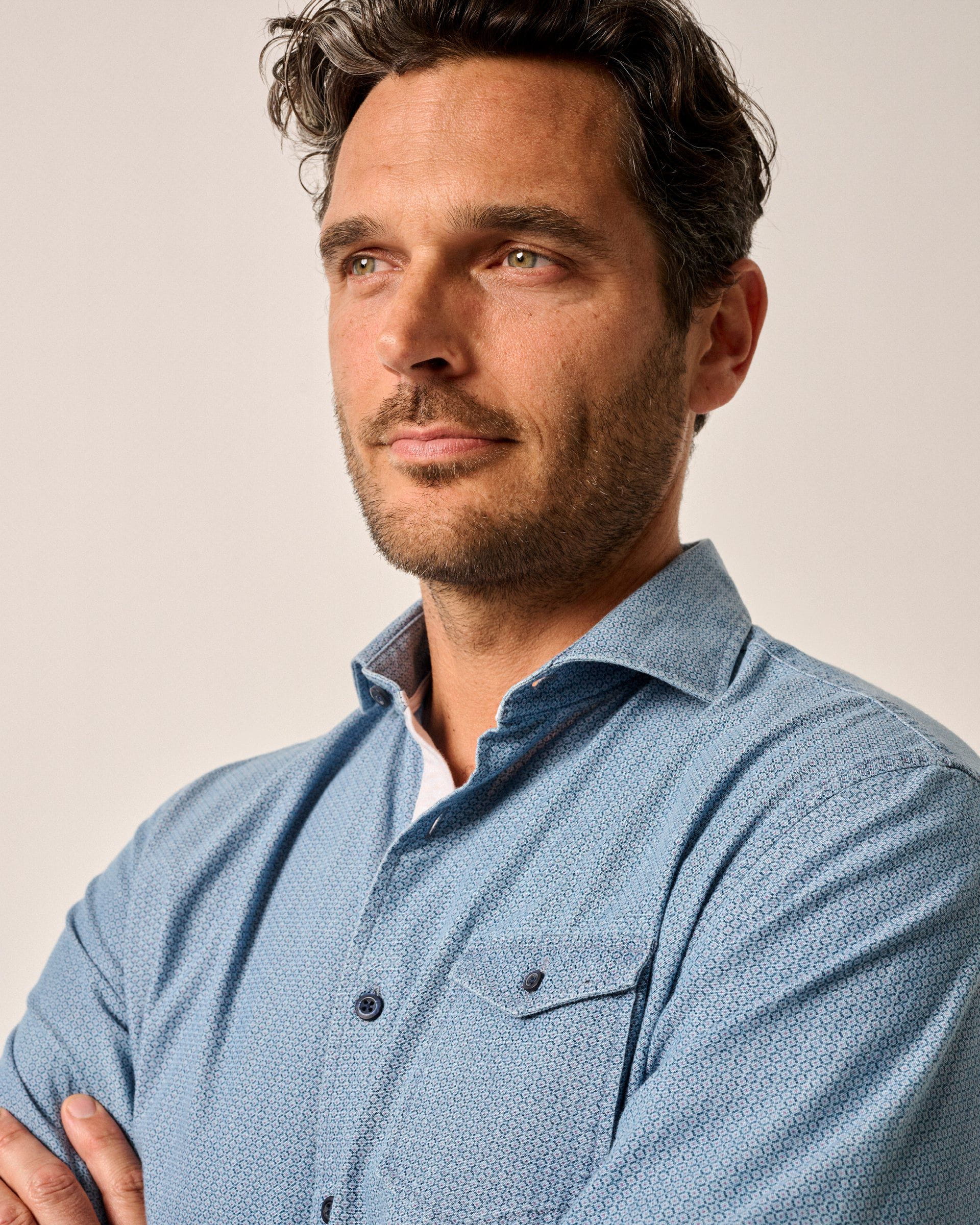 Made with 100% cotton and our Hangin' Out length for guys who embrace the untucked look, this button-up is finished with our signature Tweener Button®, which is hidden between the 2nd and 3rd button to give you the perfect amount of coverage.