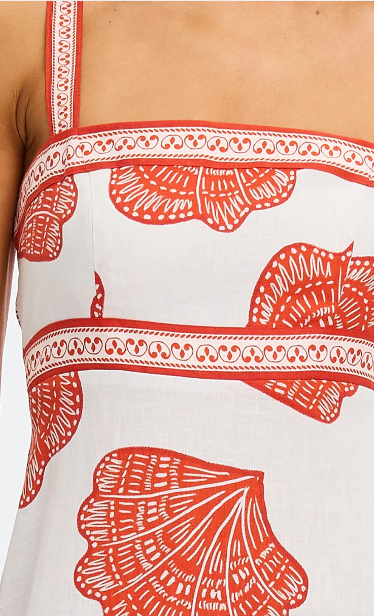 Zula is intricate red shell motifs on a crisp white base. The Zula Maxi Dress features a straight neckline with adjustable straps and a subtly flared hem, finished with a placement border print throughout. Designed to drape effortlessly, it brings refined simplicity and ease to every moment. Style with sandals for long lunches and coastal escapes.