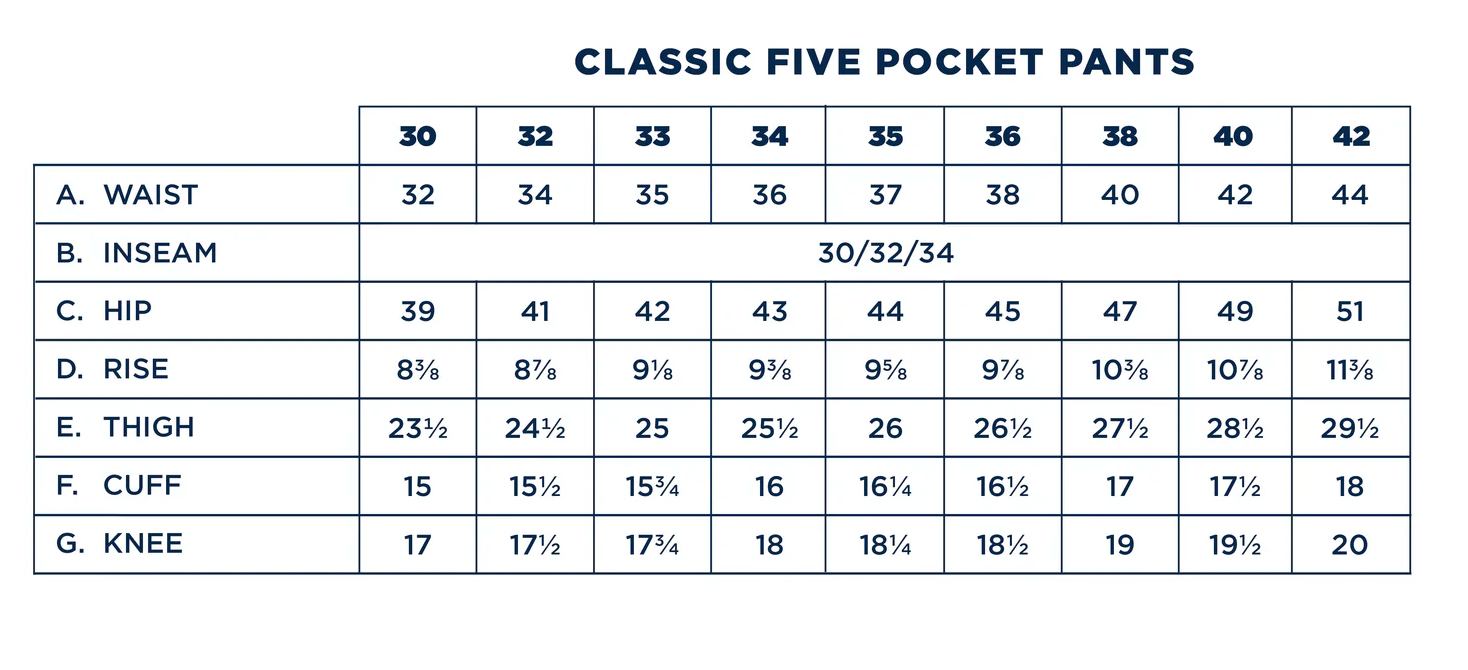 Our most popular pant is back for good: the Classic Five Pocket. These enzyme-washed pants have an ultra-soft feel with a faded look. Meaning? You wont ever want to take them off. From our head of product, Mike, An easy fitting five pocket pant with a mid-rise that sits slightly higher on the hips and offers a little more room in the seat, thigh, and leg than a slim fit... a classic straight leg cut from the hip to the bottom leg opening." If in-between sizes we recommend sizing up.