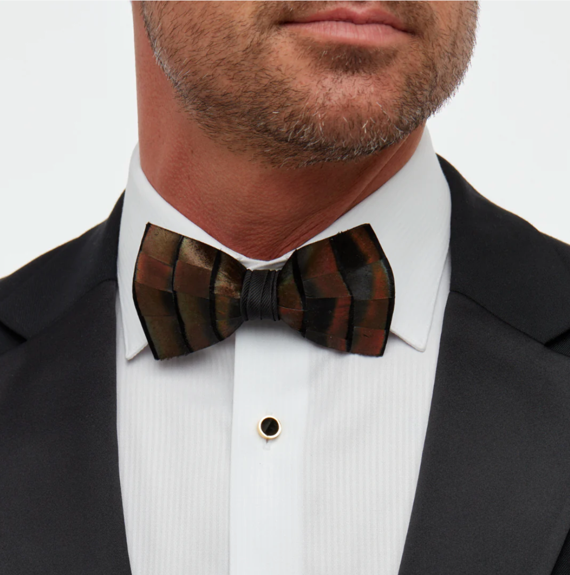 The design that started it all, the Original turkey feather bow tie is crafted with varying shades of black, olive, and subtle hints of copper. The iridescence of the feathers promotes different shades depending on how the angle of light hits it. Center wrap is black grosgrain.