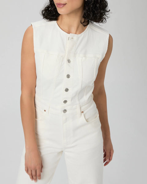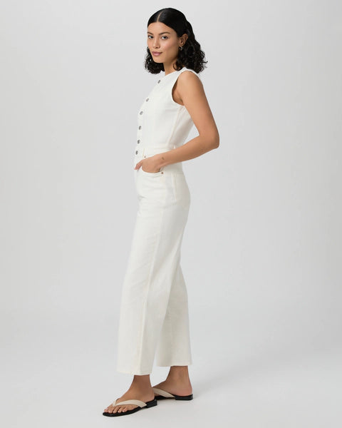 The must have one-piece of the season. This sleeveless ankle-length jumpsuit is crafted from super soft denim with a hint of stretch for added comfort in tonal ecru with a slightly relaxed straight leg silhouette, silver front buttons, princess seams, a rounded neckline, and double chest pockets. The Cirie Jumpsuit is perfect for pairing with sneakers, heels, or flats.