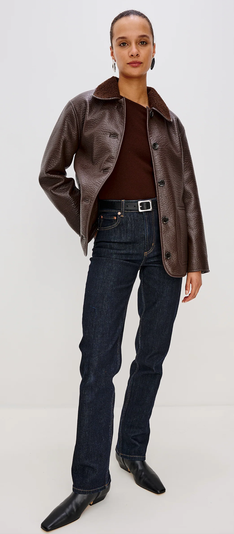 Luxurious warmth meets elevated style in the Luis. Constructed from sumptuous vegan pebbled leather with a plush faux-shearling collar and lining, this sophisticated jacket features front button closures and zippered side pockets with O-ring pulls for a refined finish.