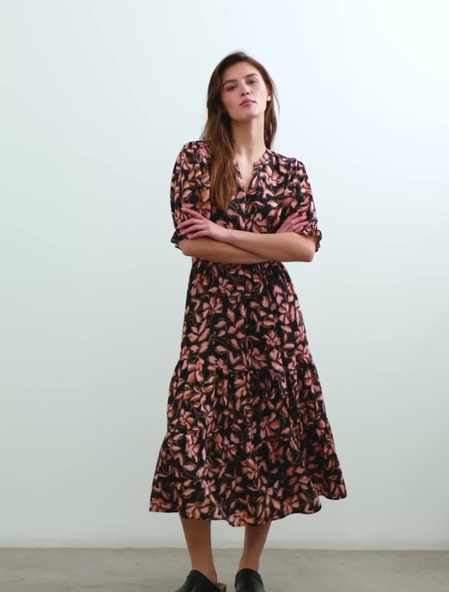 The Eliana dress features a ruffle hem and shirred short sleeves, cut from an autumnal-printed cotton poplin for a free-flowing silhouette
