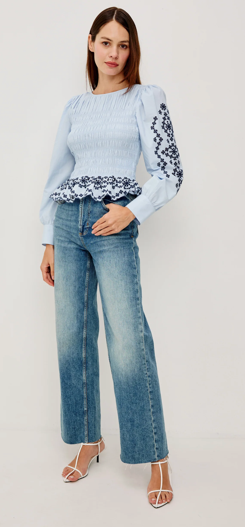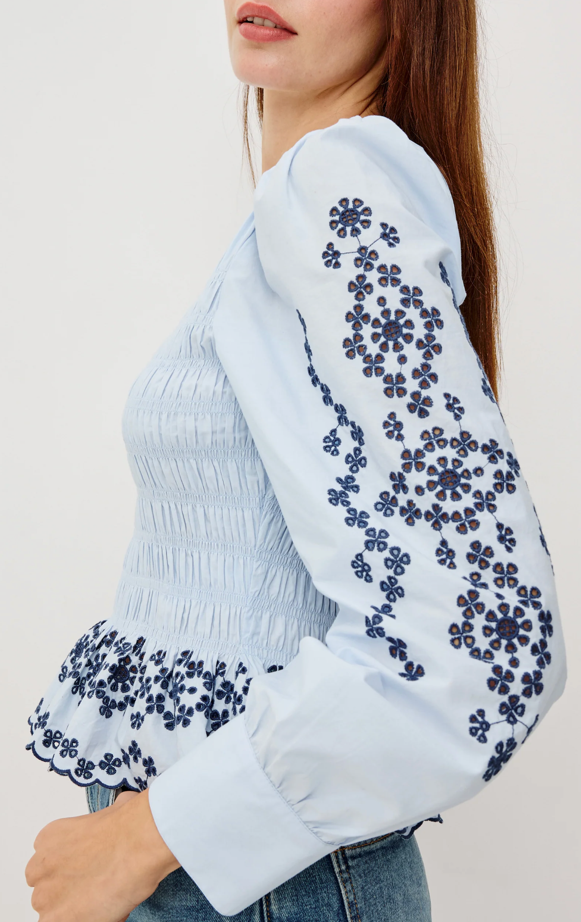 The Tabi blouse embodies sophisticated charm in crisp, lightweight poplin, featuring a smocked body, long puff sleeves with fitted cuffs, contrast embroidery at the sleeves and peplum hem, and a back keyhole with loop-button closure.
