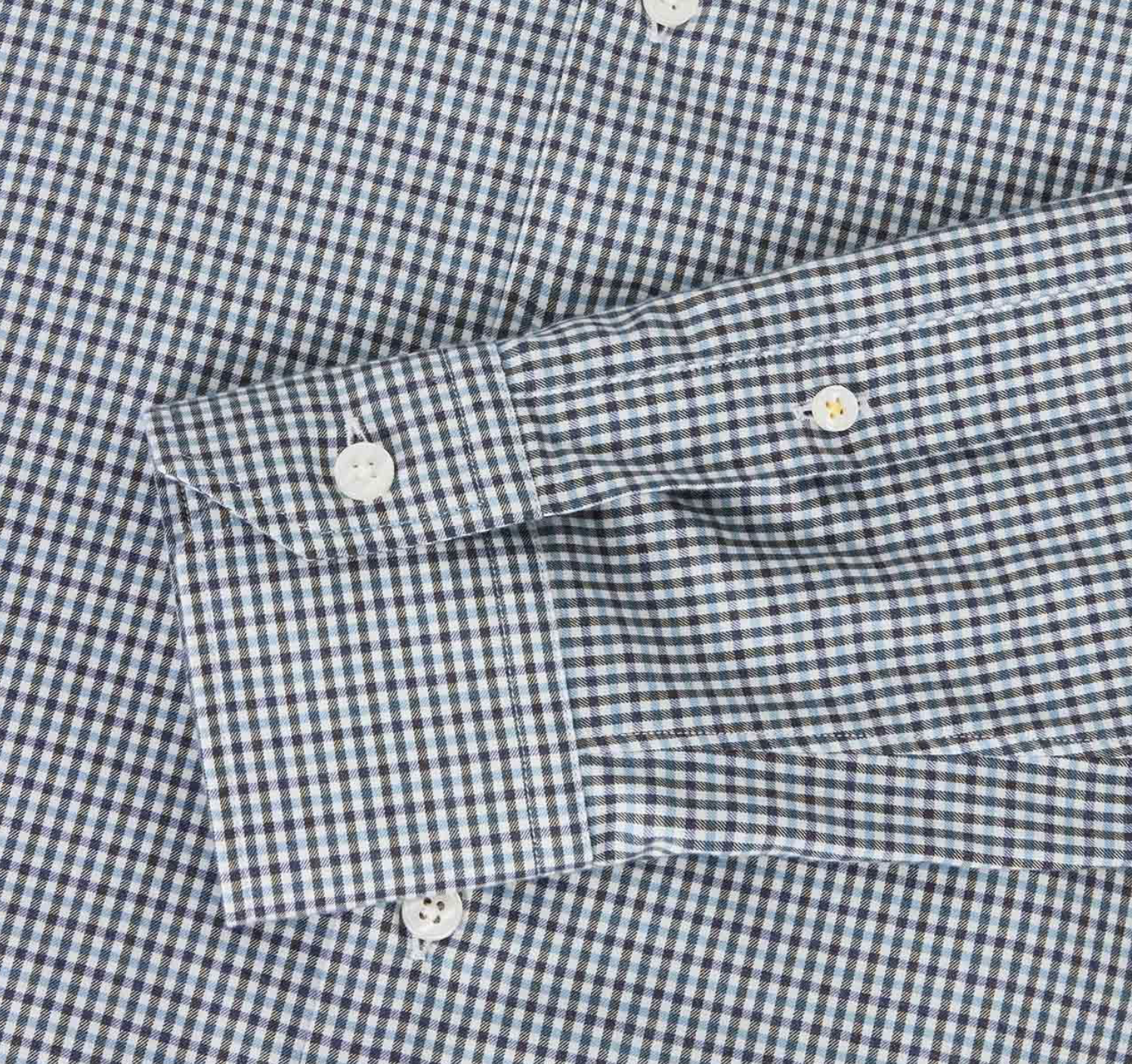 Designed with a Monterey semi-spread collar, French placket, and single-needle tailoring. Finished with signature Robert Talbott details, including gold piping at the inside neck, contrast thread at the bottom buttonhole and sleeve placket.