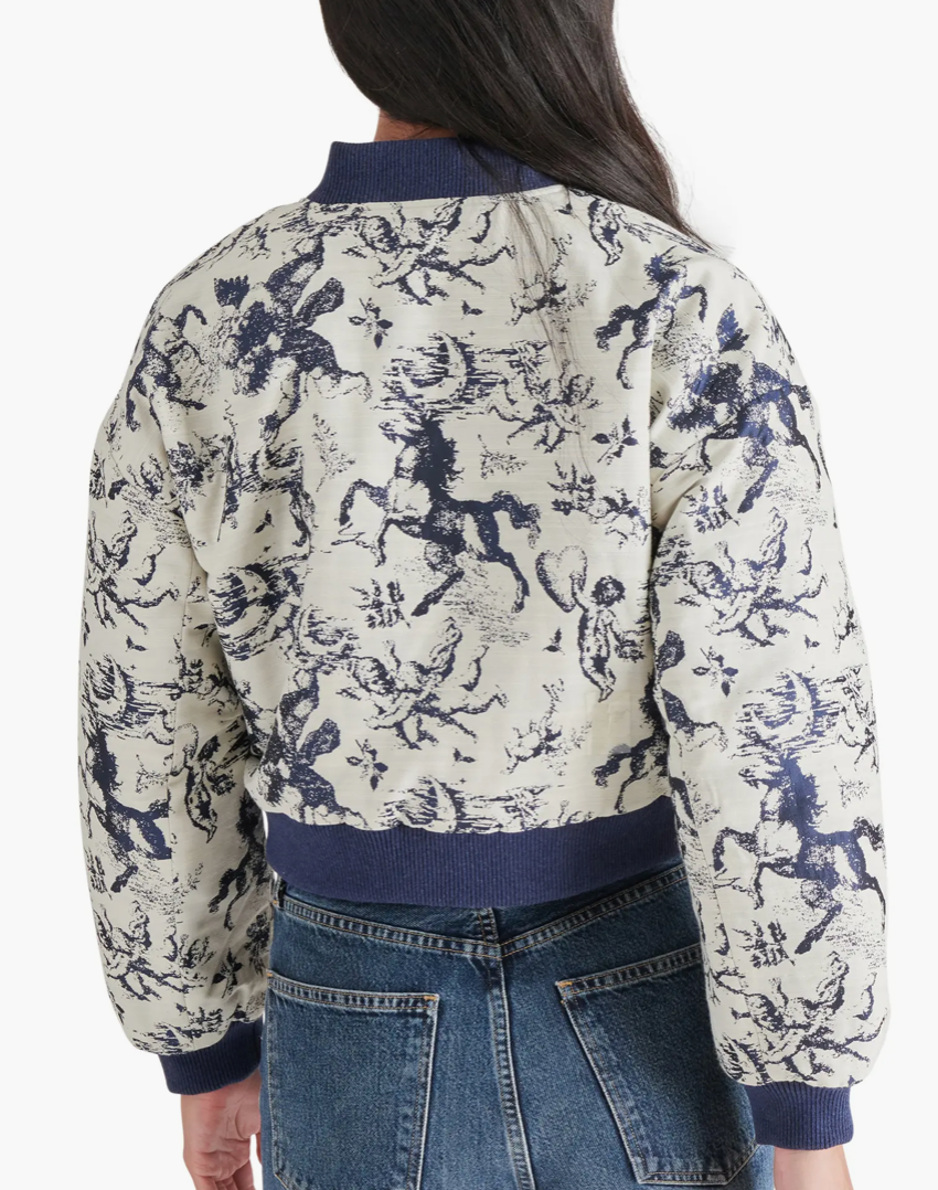 An artsy allover print elevates this cozy bomber jacket trimmed with solid ribbing and perfect for adding eye-catching style to any look you pair it with.