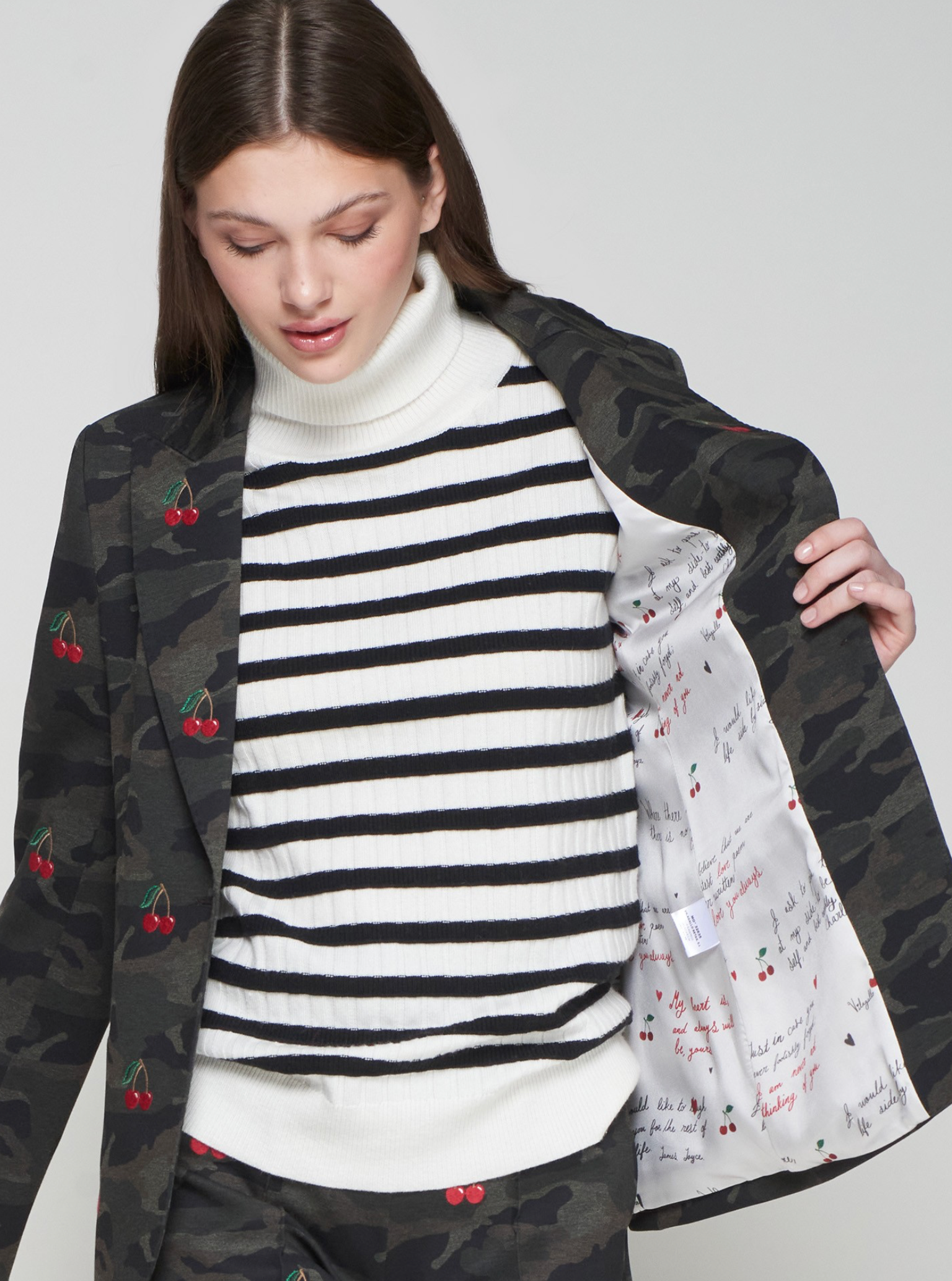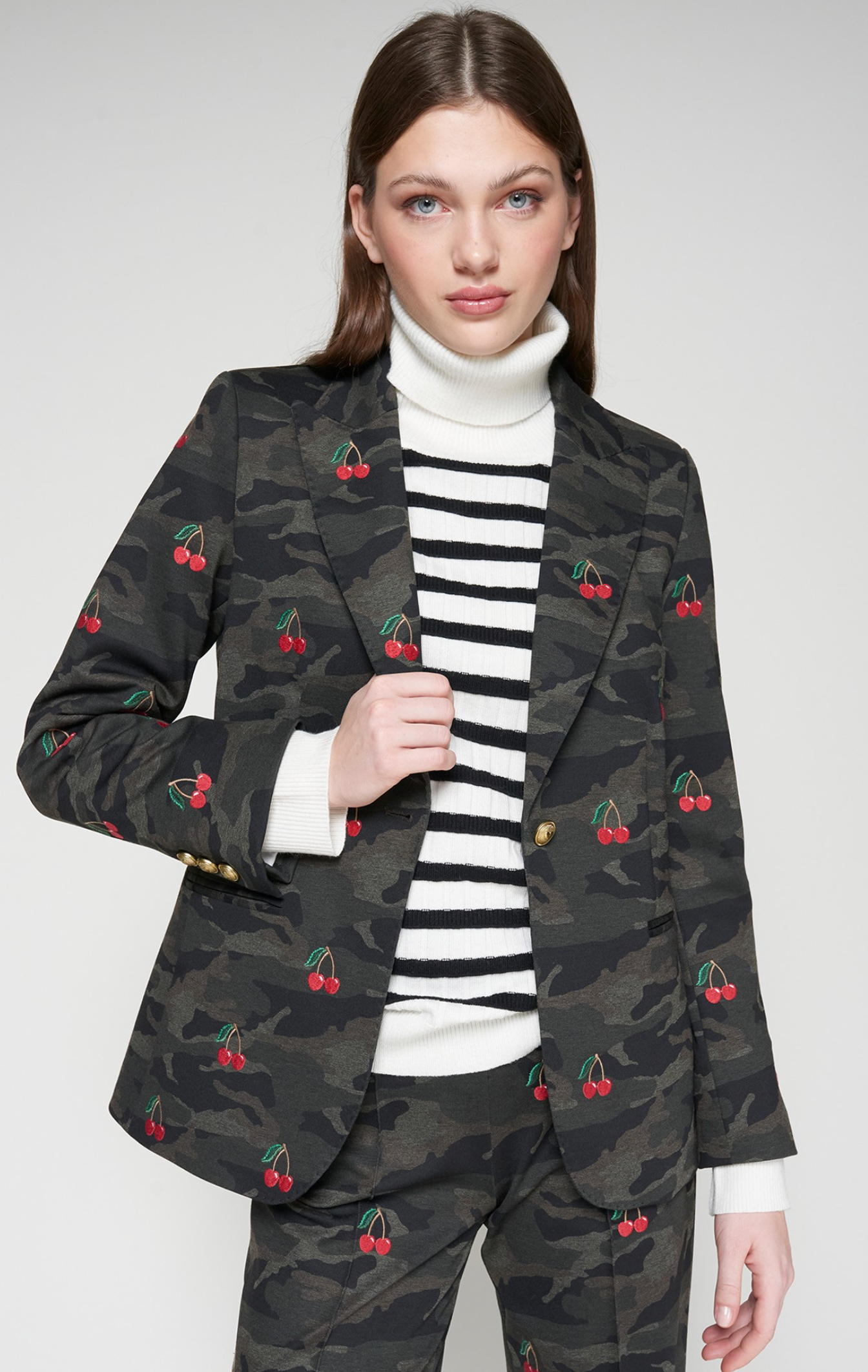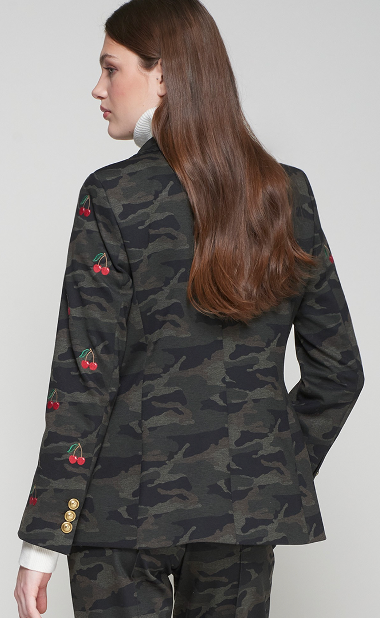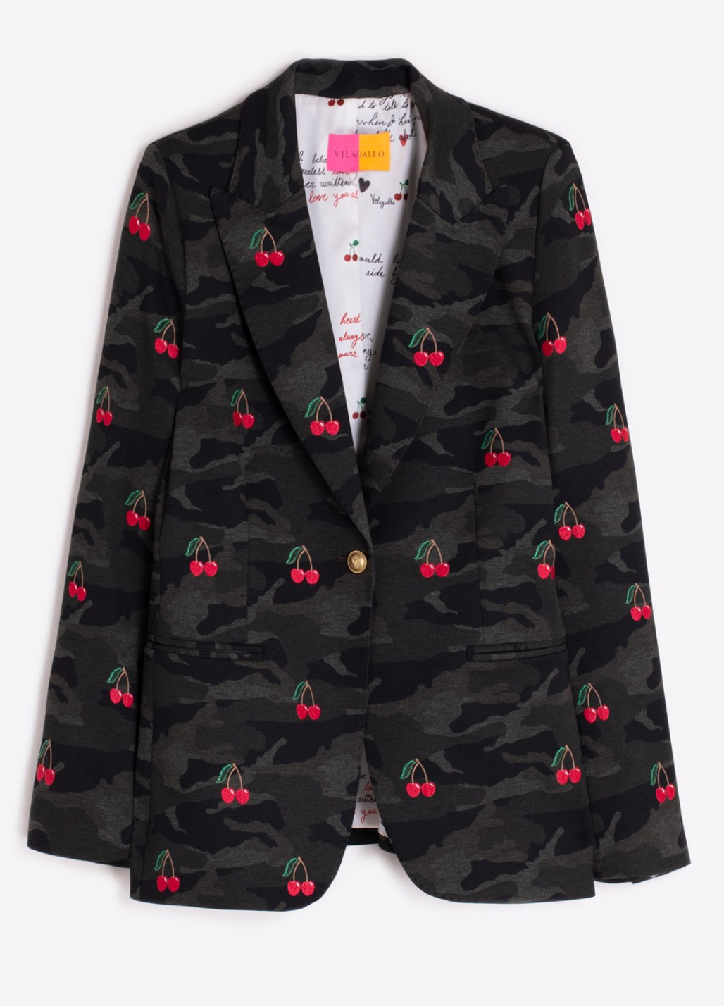 Knit blazer with a dark camouflage and red cherry embroidery. Tailored silhouette with classic lapel, gold decorative front button and straight hem. Sleeve cuffs finished with a row of gold buttons.