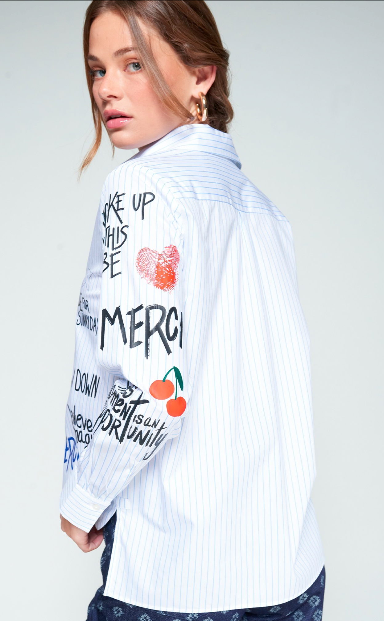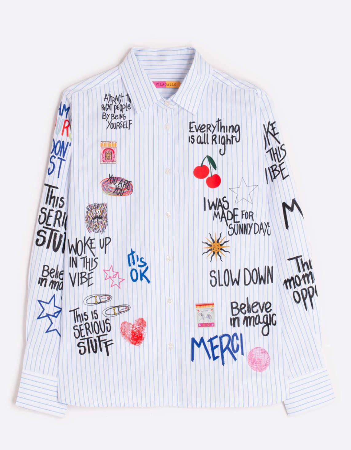 White shirt with thin blue vertical stripes, made from 100% cotton. Features playful screen-printed texts and illustrations on the front and both sleeves. Classic shirt collar and front closure with visible buttons. Straight cut with slightly rounded hem and buttoned cuffs.